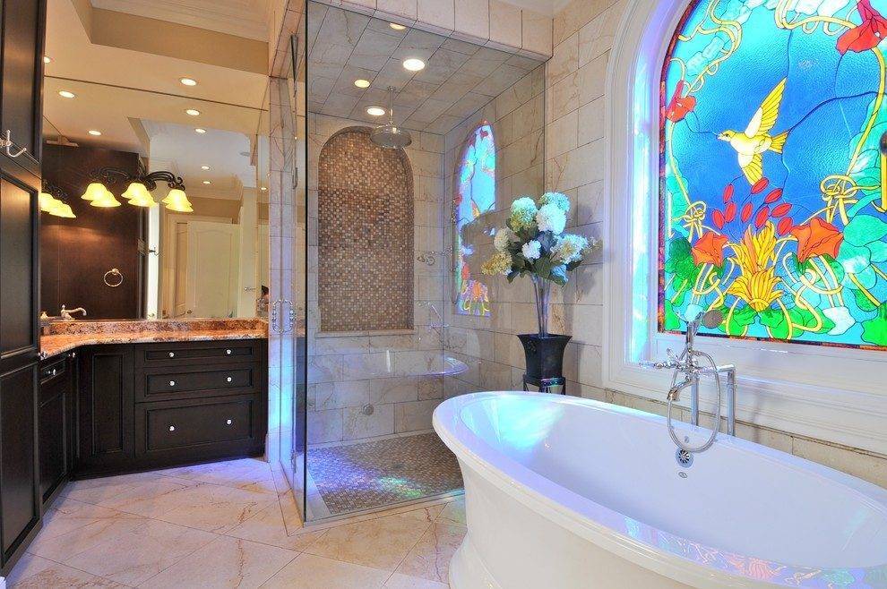 Эффектно смотрятся не только красивые цвета, узоры, перенесенные на пленку в виде витража, но и нежный туман, прозрачные изображения, создающие интерьер более интимный.