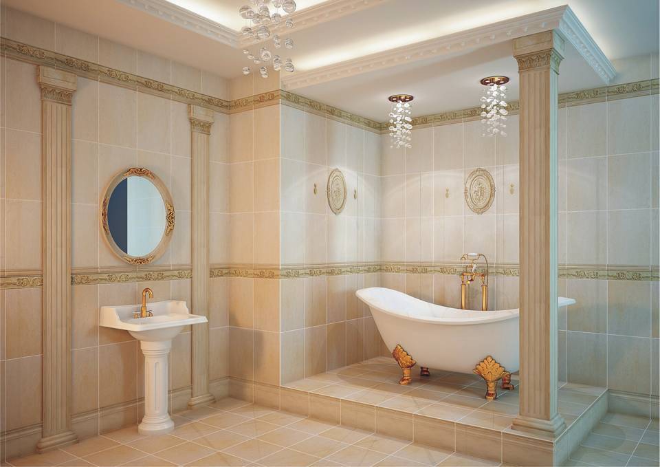 3 — для общего освещения пространства, создания особой атмосферы и реализации дизайнерского решения помещения (при учете, что площадь и высота потолка позволяют) можете смело вешать люстру в ванную комнату. Если она висит на безопасном от воды расстоянии, в помещении работает вентиляция, порадуйте себя желанным светильником в ванной.