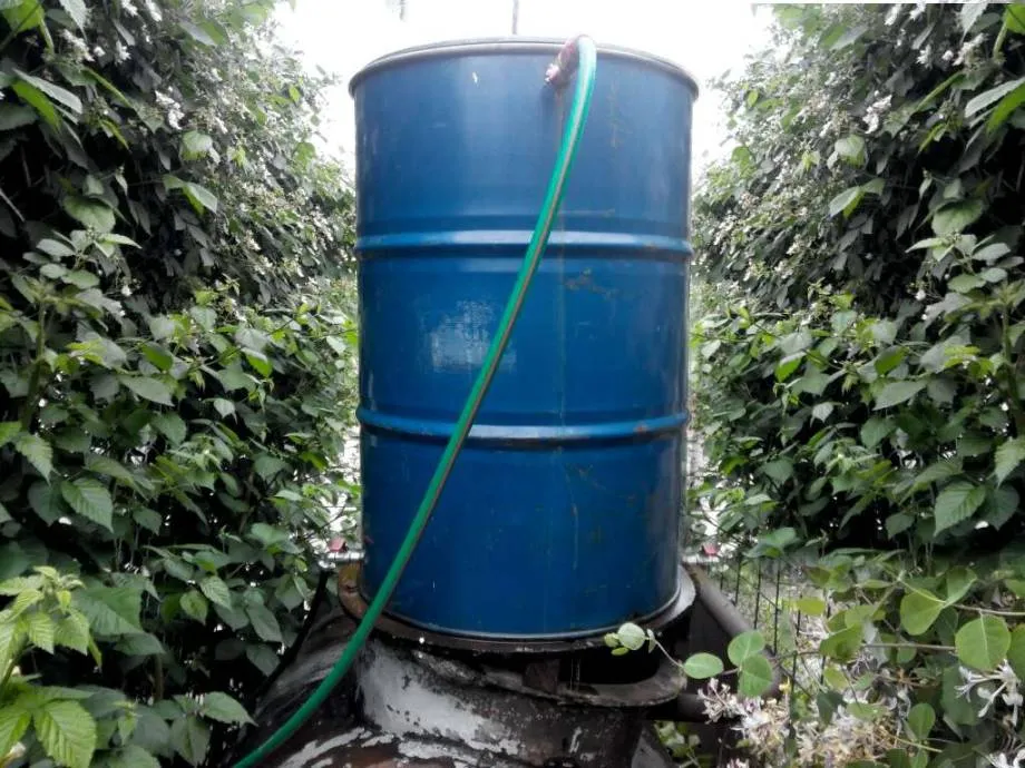 На штуцер надевается резиновый шланг, который опускается в неглубокий колодец. Недостаток конструкции в том, что она может обеспечить подъем воды без электричества всего на высоту в 6 метров. Предварительно бочка должна иметь в себе не меньше литра воды.