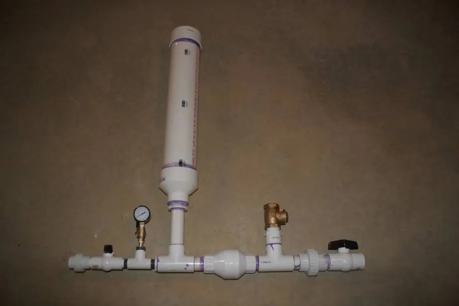Необходимо собрать следующую конструкцию из пластиковых труб, металлических клапанов и двух шаровых кранов. На тройник навинчивается запорный вентиль. Через него будет подаваться вода в устройство. Верхний выход тройника заканчивается клапаном, который будет закрываться на пике давления.