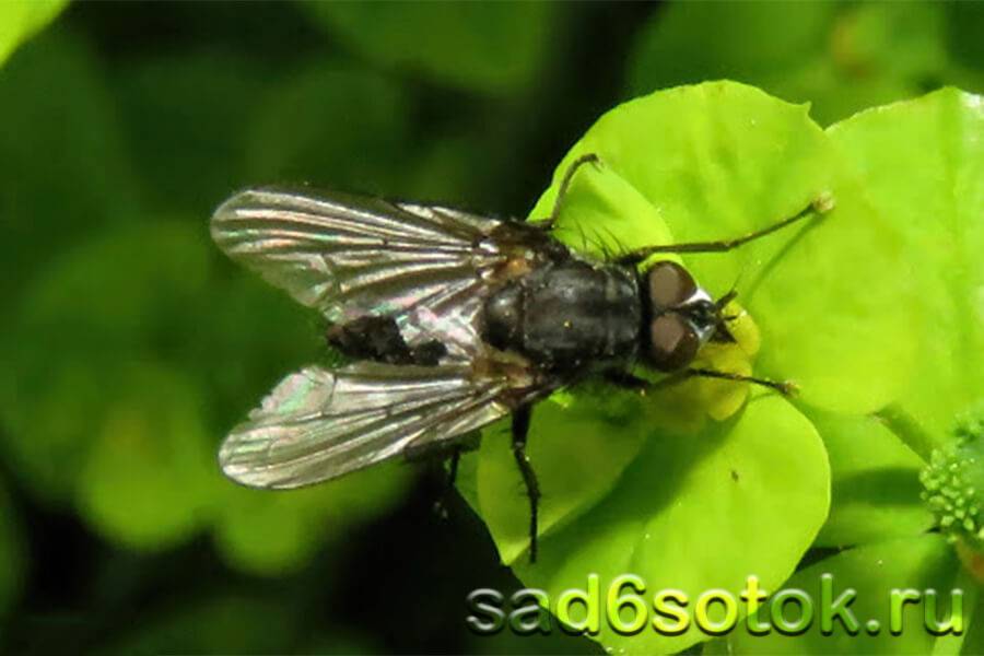 Белые личинки мухи ростковой (Delia platura) поражают семена растений в тот момент, когда те начинают прорастать. Если всходы и появляются, то с поврежденными стеблями и листьями. Ростковая муха внешне похожа на комнатную.