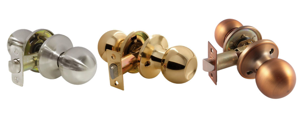 Технология монтажа круглых дверных ручек (кнобов) отличается от процесса установки нажимных изделий. Это связано с конструктивными особенностями подобной фурнитуры. Монтаж ручки может производиться как на снятом, так и на навешенном полотне. Второй вариант является более приемлемым, так как упрощает разметку ответной планки на дверной коробке.