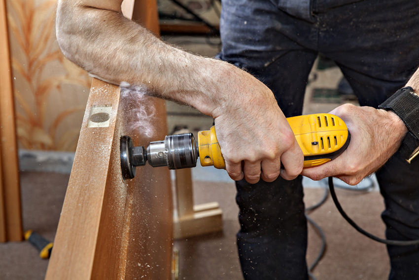 Вначале необходимо подготовить инструмент, который будет использоваться для организации отверстий. Проще всего эту работу выполнить с помощью шуруповерта и специальной насадки (коронки по дереву). Отверстие для механизма запорного прибора производится на плоской поверхности дверного полотна. Причем сначала следует сделать углубление на внешней стороне, а затем на внутренней. Такой порядок действий позволит избежать повреждения электронного шуруповерта.