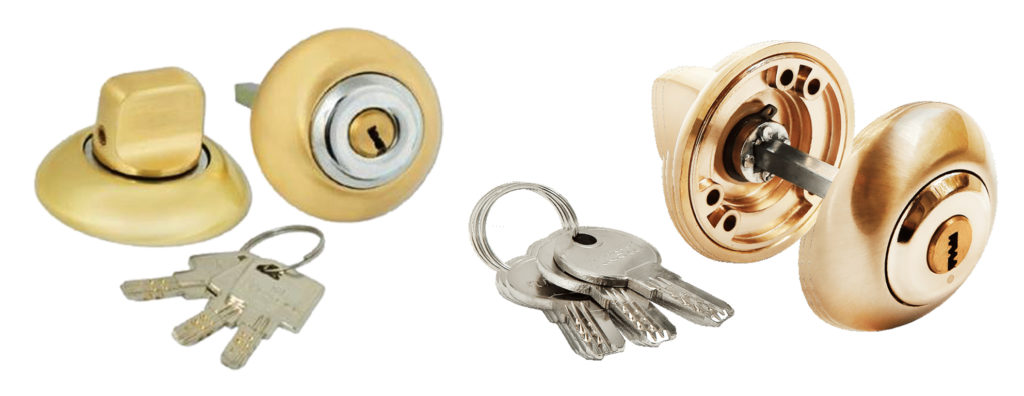Скважина для ключа может быть двусторонняя, или только с одной стороны, а с другой фиксатор защелки (ручной блокиратор).