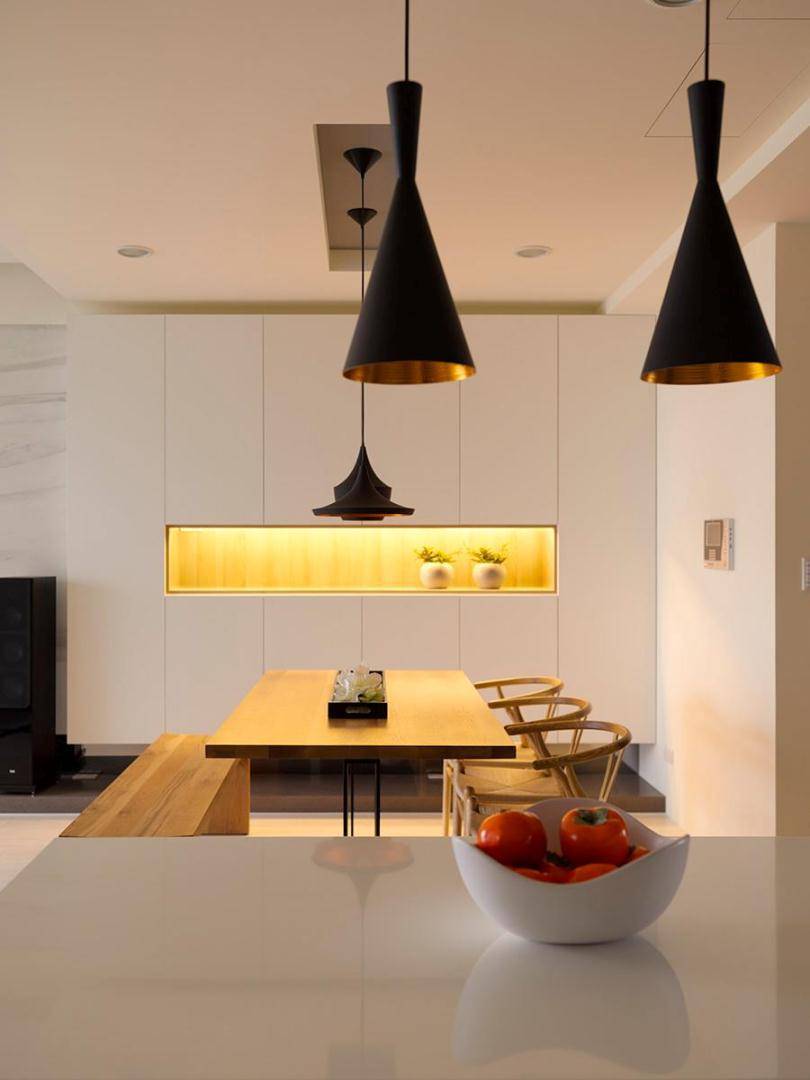 Черные светильники выгодно выделяются на фоне светлого потолка, при этом они сразу освещают три зоны кухни