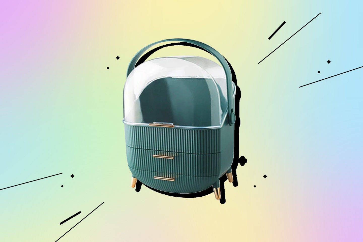 Акриловая косметичка доступна в белом и зеленовато-сером цвете. В верхнем отделении удобно хранить высокие банки, а в нижних ящиках — кисти и тени. У продавца есть несколько вариантов размера и дизайна ящика. Есть даже ручка, чтобы было удобно переносить органайзер.