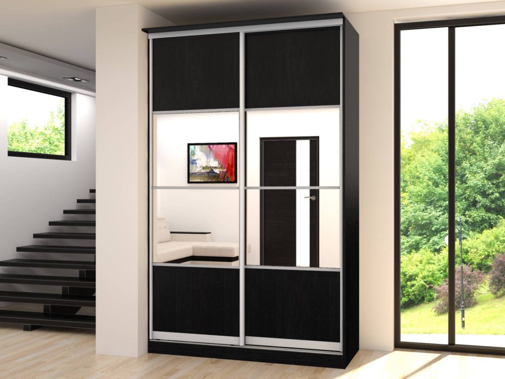 Зеркало в полный рост, установленное на внешней стороне раздвижной дверцы, удобно, в нем можно оглядеть себя перед выходом на улицу; при этом оно служит декоративным элементом, а также зрительно «раздвигает» границы небольшого помещения, делая его более светлым и просторным.