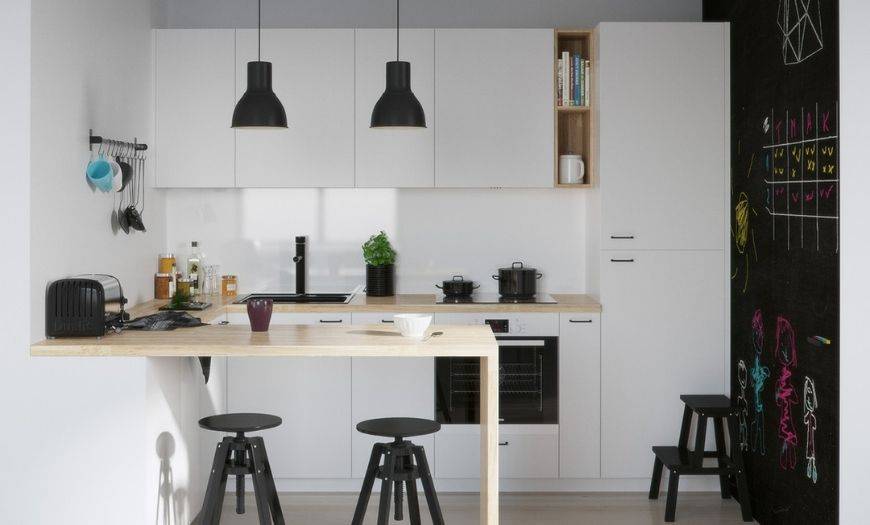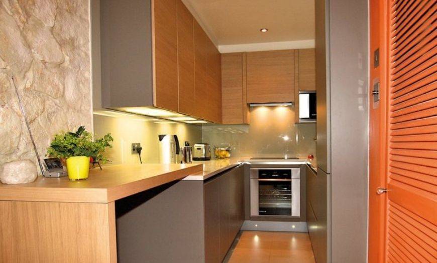 Один из самых распространённых вариантов кухонного дизайна, так как занимает минимум места.