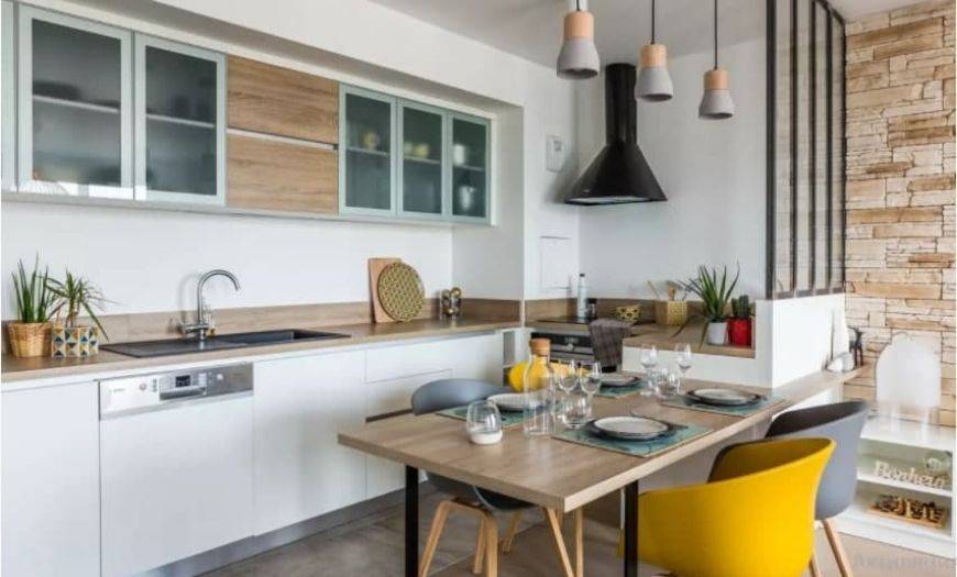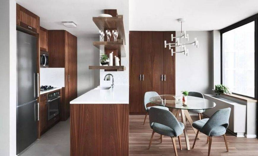 Как уже упоминалось в самом начале, отсутствие шкафов – это не только красивый элемент кухни, но и снижение функциональности всего пространства. Не все готовы на этой пойти. Для таких людей есть вариант, который позволит сохранить многофункциональность кухни, а также облегчить ее: от шкафов освобождают только одну сторону и создают угловую планировку.