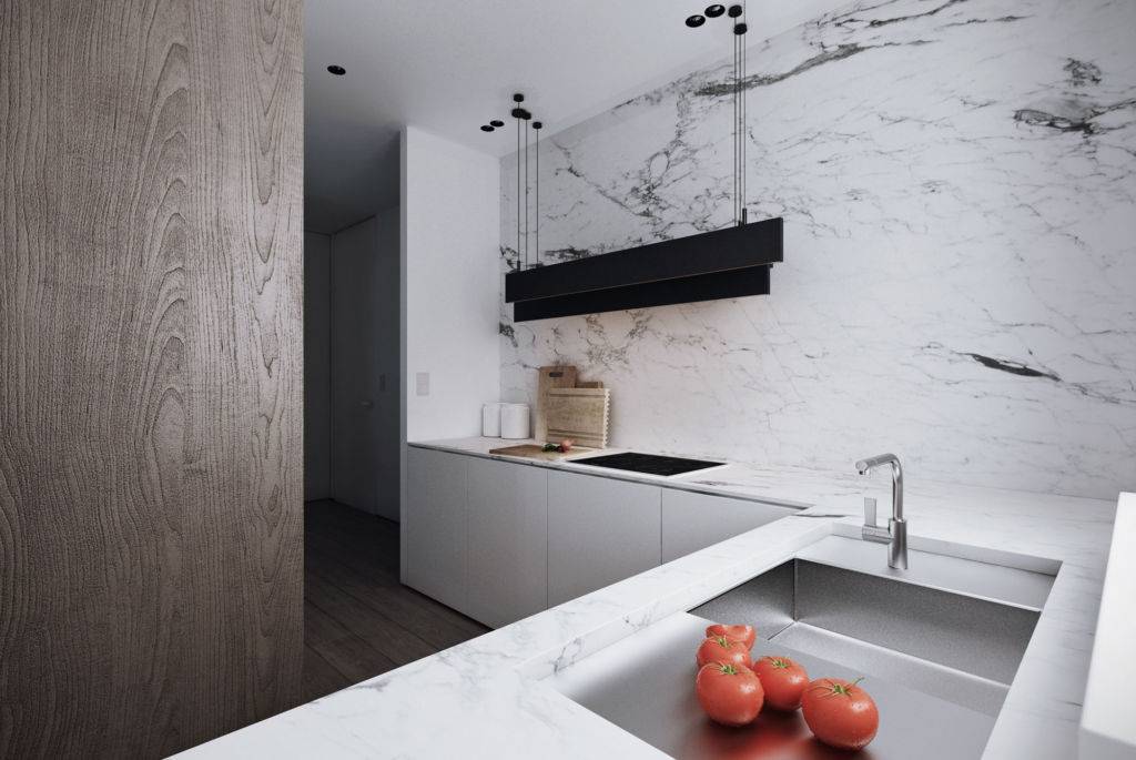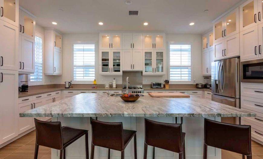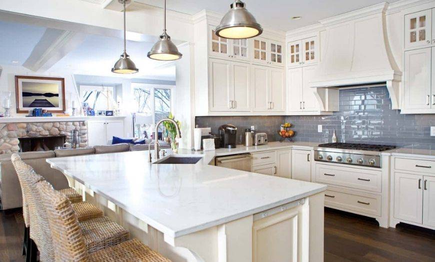 Белые шкафы-колонны хорошо перекликаются с белыми фасадами гарнитура. Напольное покрытие из серого кафеля составит тандем столешницам из серого мрамора. В торце кухни, у большого окна удобно расположится обеденный стол. И всю эту красоту завершит многоуровневый потолок с точечными светильниками.