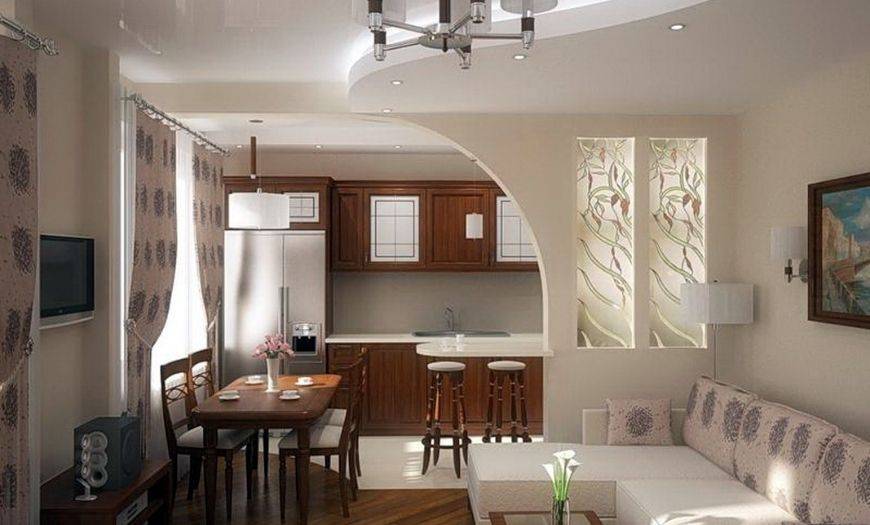 При совмещении кухни с гостиной часто нужен снос перегородок и стен, что освобождает дополнительную площадь для размещения всех необходимых предметов. При оформлении такого пространства рекомендуется размещать всю мебель вдоль стен, оставляя центр свободным для передвижения.