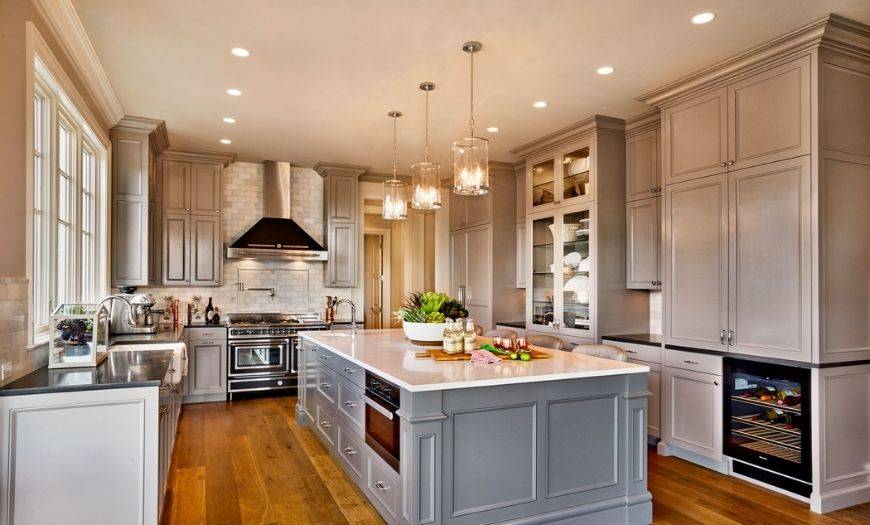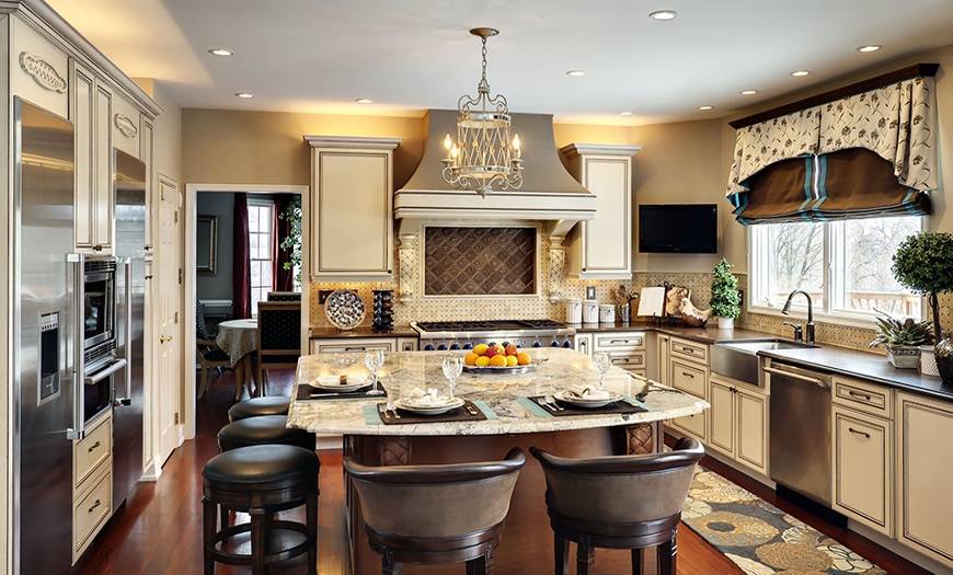 4. Если помещение, отведенное под кухню, является достаточно просторным, то подумайте о создании «острова». Расстояние между островом и остальной частью кухни должно быть примерно 1 м. Он обязательно должен оснащаться светильниками и тумбочками для хранения разных кухонных принадлежностей. Кроме того, в него обычно включают плиту с вытяжкой или раковину.