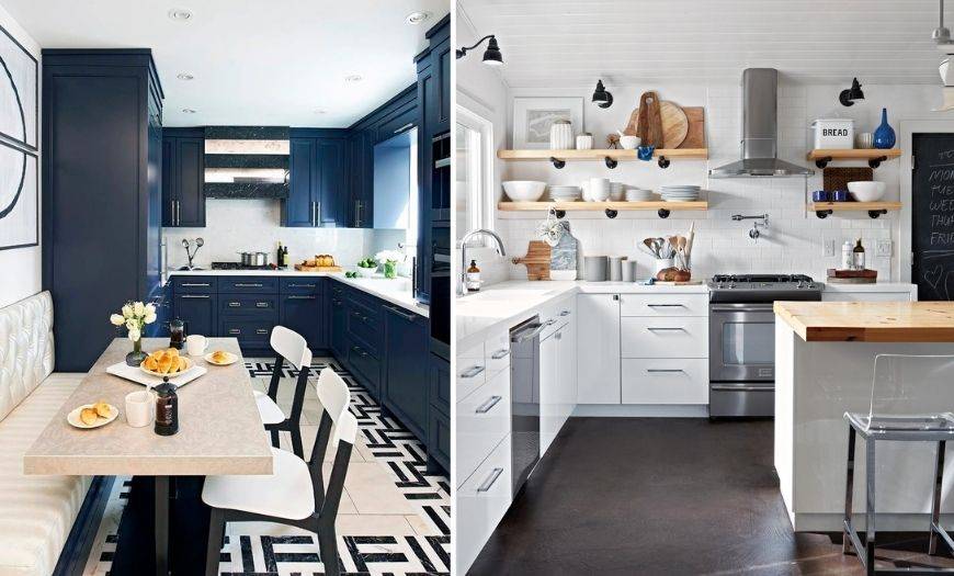 Золотых стандартов для планировки кухни без верхних шкафов не существует, она может быть реализована как в длинных и узких комнатах, так и в просторных студиях. Форму расстановки мебели следует выбирать, исходя из параметров кухни.