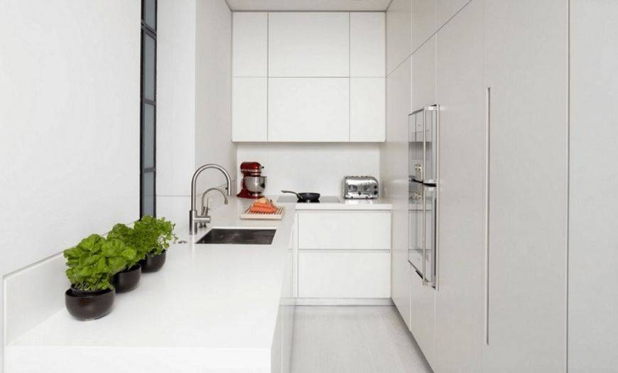 В таком варианте дизайнеры располагают шкафы-пеналы и устанавливают колонны для получения большого количества пространства для хранения. Преимущественно используют встроенную технику для приготовления пищи и хранения продуктов.