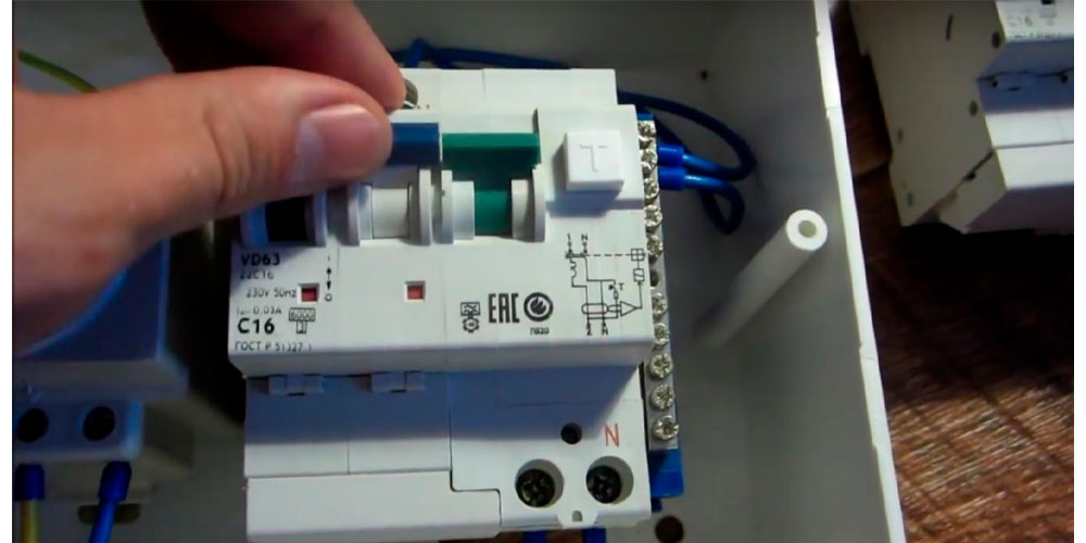 На корпусе УЗО, помимо рычажка включения цепи, имеет еще и кнопка «Тест». Нажатием на нее «моделируется» ток утечки – замыкается внутренняя цепь через встроенную нагрузку. Если прибор исправен, то он должен мгновенно отключиться.