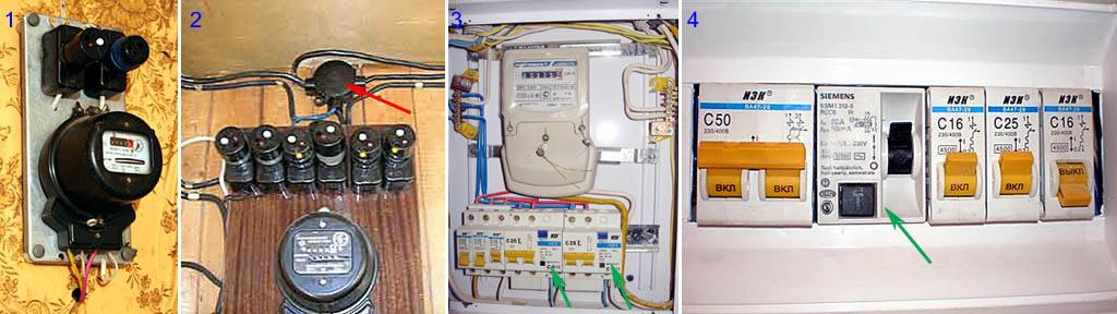 Защитная автоматика в квартире чаще всего монтируется рядом с электросчетчиком на вводном щите ВЩ. Если защита пробками, ВЩ может быть совершенно допотопным (поз. 1 на рис.), халтурно сделанным, поз. 2, но рядом с ВЩ всегда найдется распределительная коробка (дозатор, «доза», показано красной стрелкой). Из дозатора расходятся ветви проводки по комнатам. Так вот, открывать дозатор, не будучи электриком, нельзя. Источник неисправности в таком случае нужно искать пробными включениями (см. выше и далее).