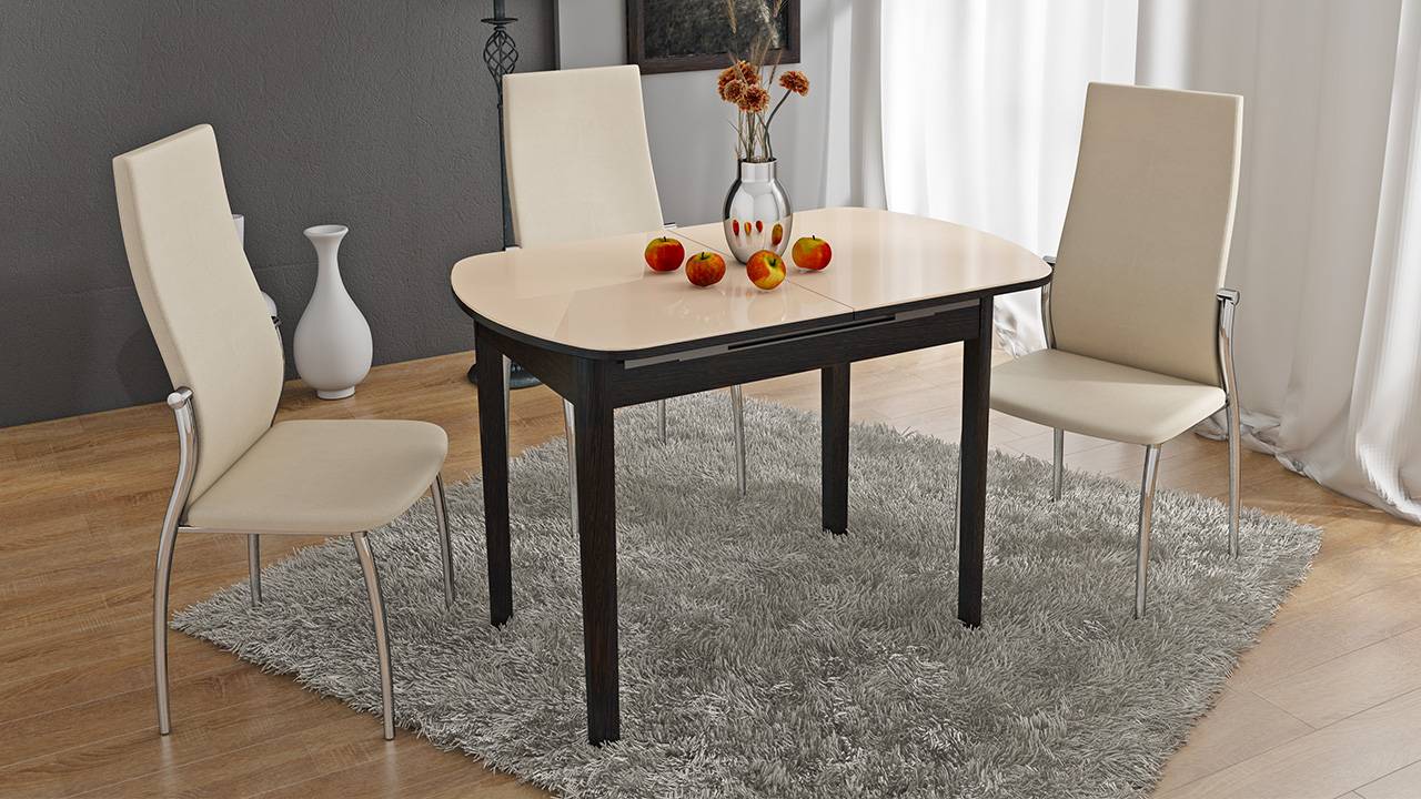 - Стекло — оно элегантно, удобно и просто в уходе. Качественное стекло не царапается. Вопреки внешнему виду, такой вариант стола очень устойчив к поломкам. Тем не менее, он не будет работать на кухне, где нет кухонных столешниц, и на нем будут выполняться все процессы, такие как отбивка мяса, использование бытовой техники.