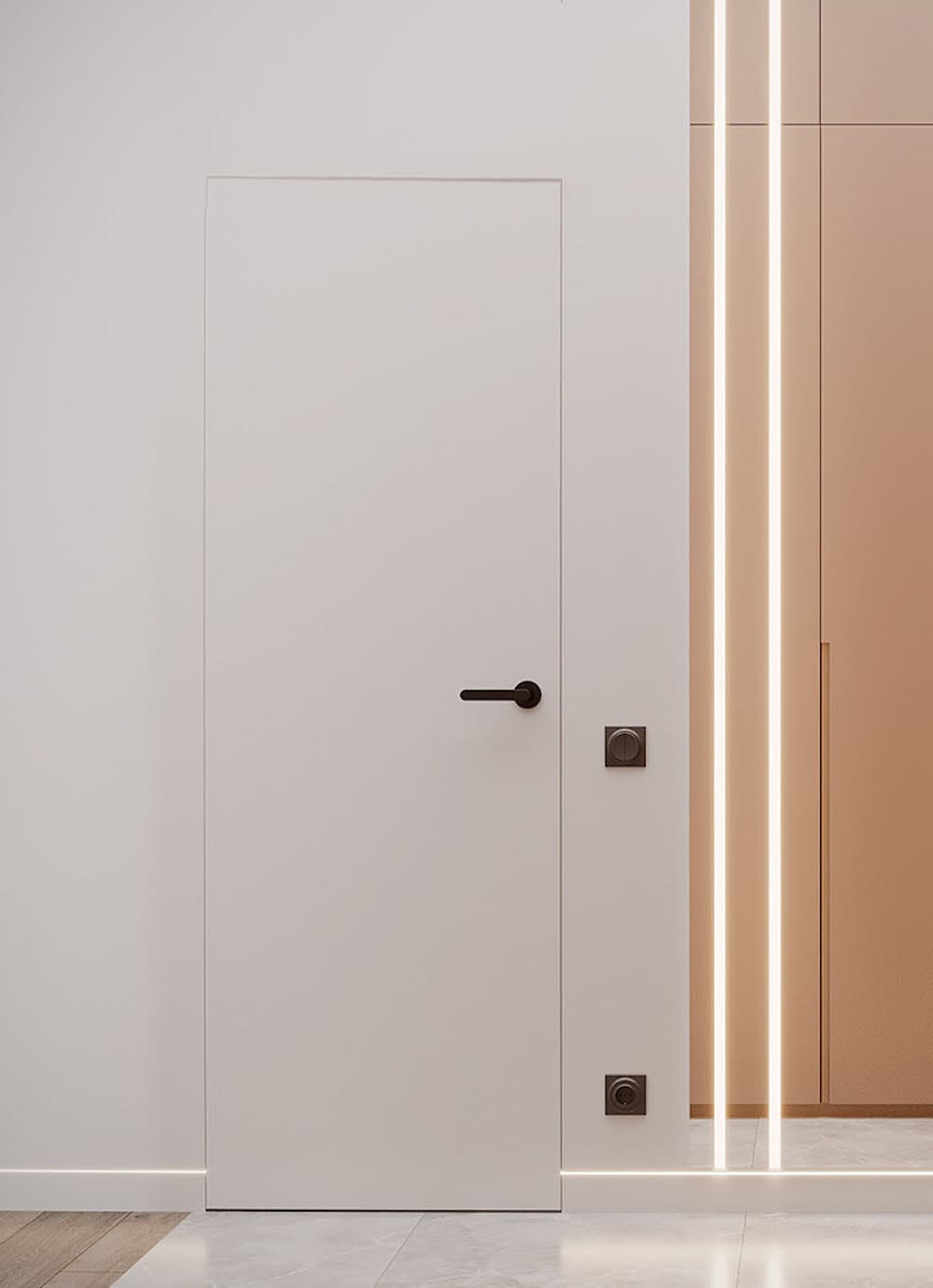 Светлые стены. Тут все неоднозначно. В зависимости от других составляющих интерьера, цвет дверного полотна выбирается того же цвета, что и стены, или отличается на два-три тона. На выбор может повлиять цвет мебели или ковра.