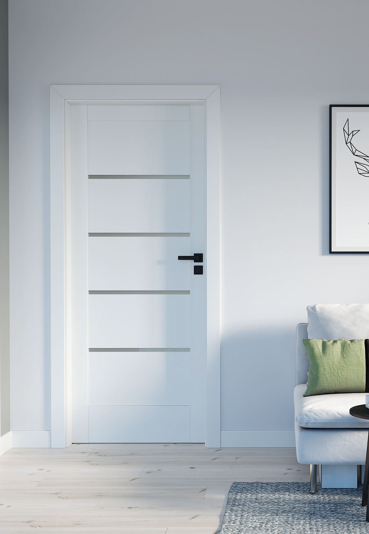 Скандинавский стиль. Светлые дверные конструкции — непременная составляющая этого направления. По форме они могут быть гладкими и филенчатыми. Популярны модели, покрытые шпоном или ламинацией, имитирующей натуральную текстуру.