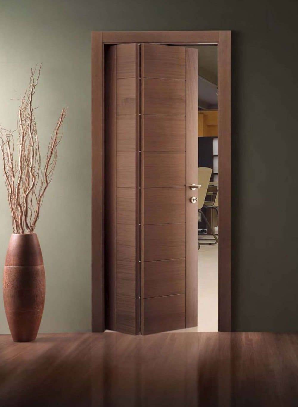 Из-за своей конструктивной особенности складные двери напоминают гармошку. Как и раздвижные, они отлично подойдут для маленьких комнат и помещений. Цена на двери складного типа намного выше, чем на предыдущие модели. Высокая стоимость, а также наличие шарниров, которые являются одним из самых слабых мест в данной конструкции, являются главными недостатками складных дверей.