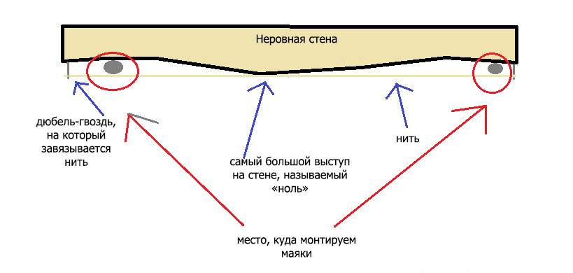 - Натянуть шнур между всеми углами стены и по диагоналям. Убедиться, что он нигде не упирается в стену.