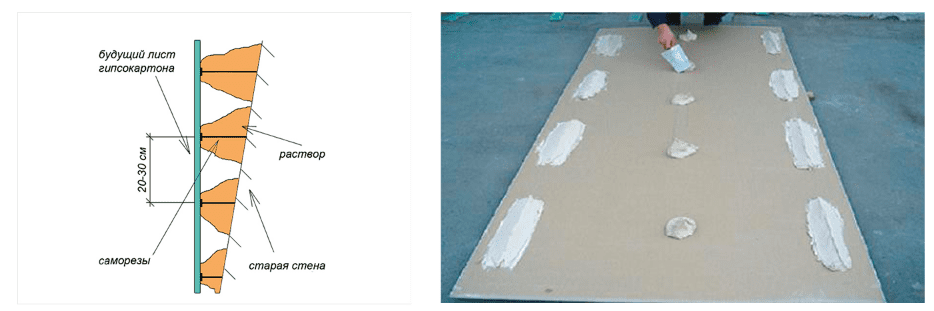 - Наносим «кучки» клея на поверхность в шахматном порядке с интервалом 20-30 см. Чем более неровная поверхность, тем больше должны быть «кучки».