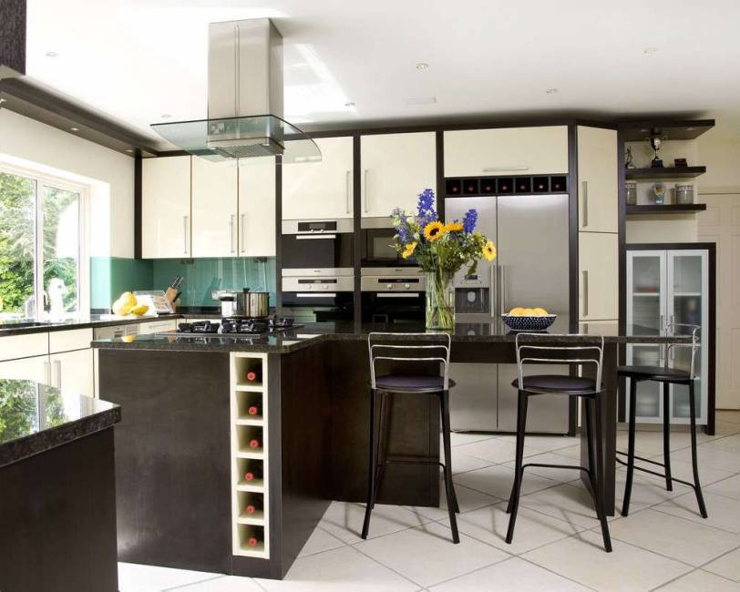 В удачном сочетании со стойкой считается относительно новым, современным вариантом оформления кухонь. Прекрасно подходит для небольших помещений, поскольку габариты имеет вполне компактные.