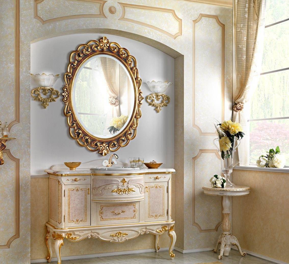 Ванная в стиле барокко отличается масштабностью и торжественностью интерьера, обязательно содержит большое количество мебели с лакированными поверхностями. Зеркала с крупной расписной рамой, покрытой позолотой, множество аксессуаров, присутствует в интерьере ванной.