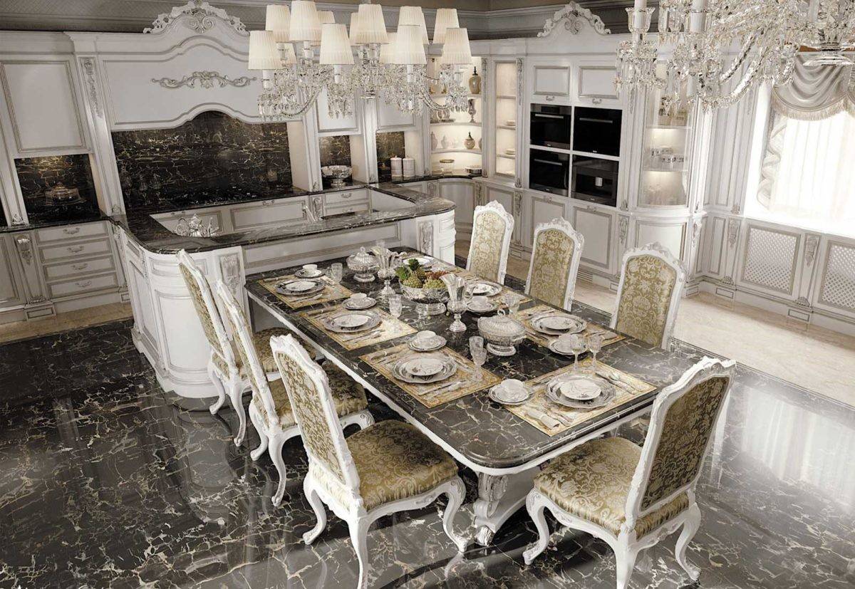 Кухня в стиле барокко позволяет создать изысканную атмосферу помещения, где обязательно расставлены серванты, навесные шкафы со стеклянными дверцами, большой обеденный стол с каменной столешницей, массивные комоды и шкафы. Рабочие поверхности изготовлены из камня или мрамора. Вся мебель кухни в стиле барокко подбирается в наборах и гарнитурах. Несомненные атрибуты кухни в стиле барокко — это:
