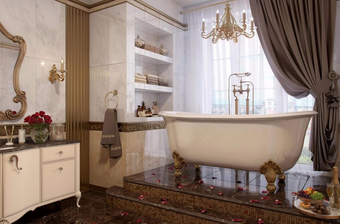 Зеркало в металлическом витиеватом багете, бра, маленькие золотые крючки, ванная на гнутых «бронзовых» ножках – несомненно, обозначат основные маркеры барокко и лёгкий Фьюжн.