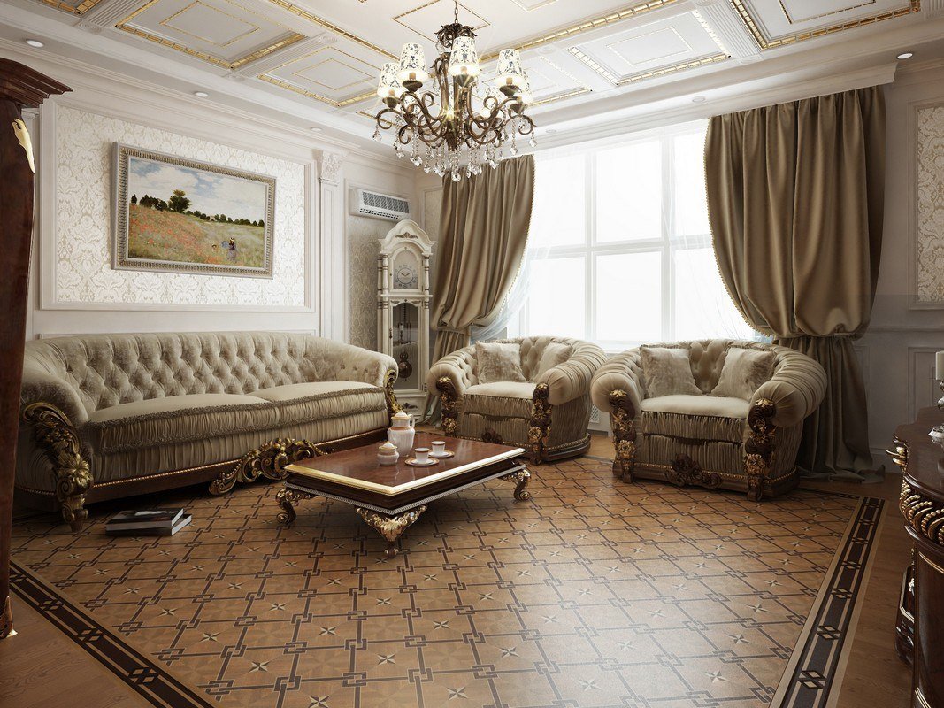 У большинства людей такой стиль ассоциируется со стабильностью и достатком. В такой атмосфере он хорошо отдыхает, чувствует себя комфортно и защищено. На людей аскетичных такой интерьер может немного давить за счет большого количества деталей, необычной отделки и дороговизны декора. Учитывая данный аспект, нужно подбирать для такой гостиной облицовку и гарнитур наиболее комфортный для собственного восприятия.