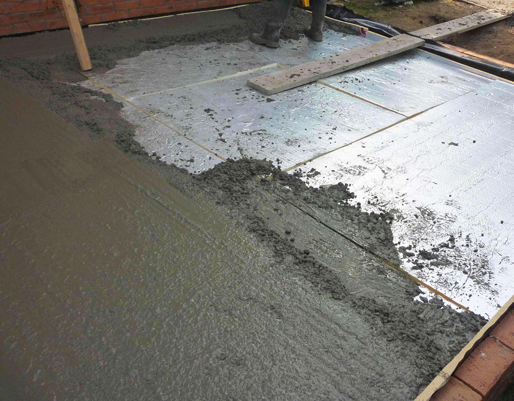 Утепление цементного пола также широко практикуется. В первую очередь, когда стяжка используется в качестве аккумулирующего слоя для тёплого пола. Тепловая изоляция выполняется материалами, устойчивыми к равномерному сжатию: плитами из вспененных полистирола и полиуретана. Толщина стяжки при этом должна составлять не менее 30 мм с обязательным синтетическим армированием. При укладке утеплителя на подсыпку требуется предварительное выравнивание промытым песком при слое в 50–70 мм.