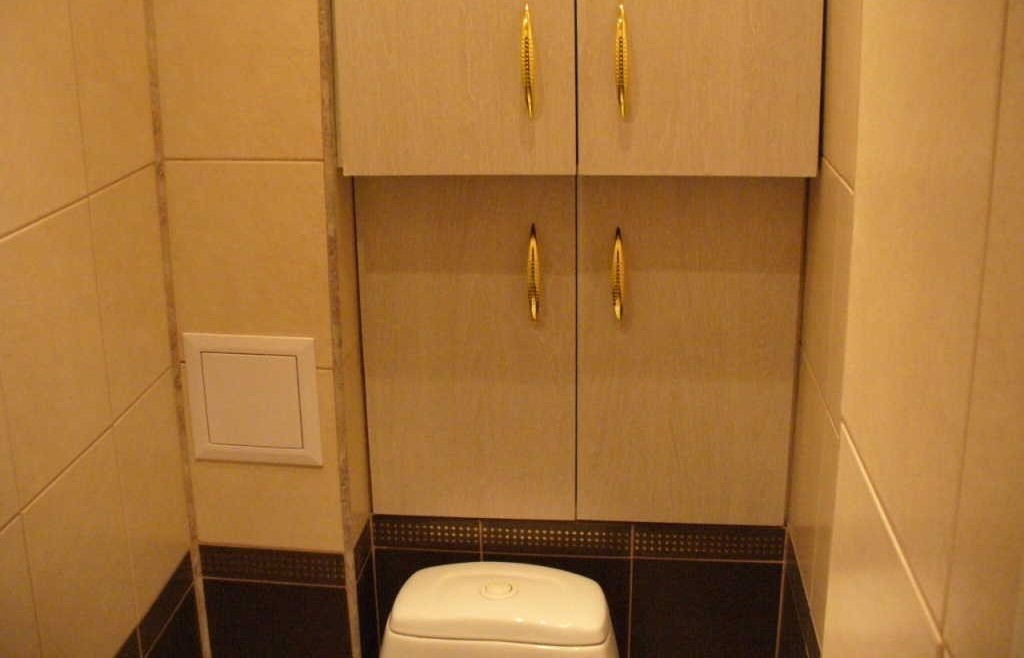 Чтобы выбрать тот или иной материал, ориентируются на интерьер санузла. Так, если дом построен из дерева, то для шкафа следует использовать любые конструкции, содержащие деревянные элементы. В случае с городским туалетом, который обшит пластиком, наиболее предпочтительным вариантом будут дверцы из пластика.