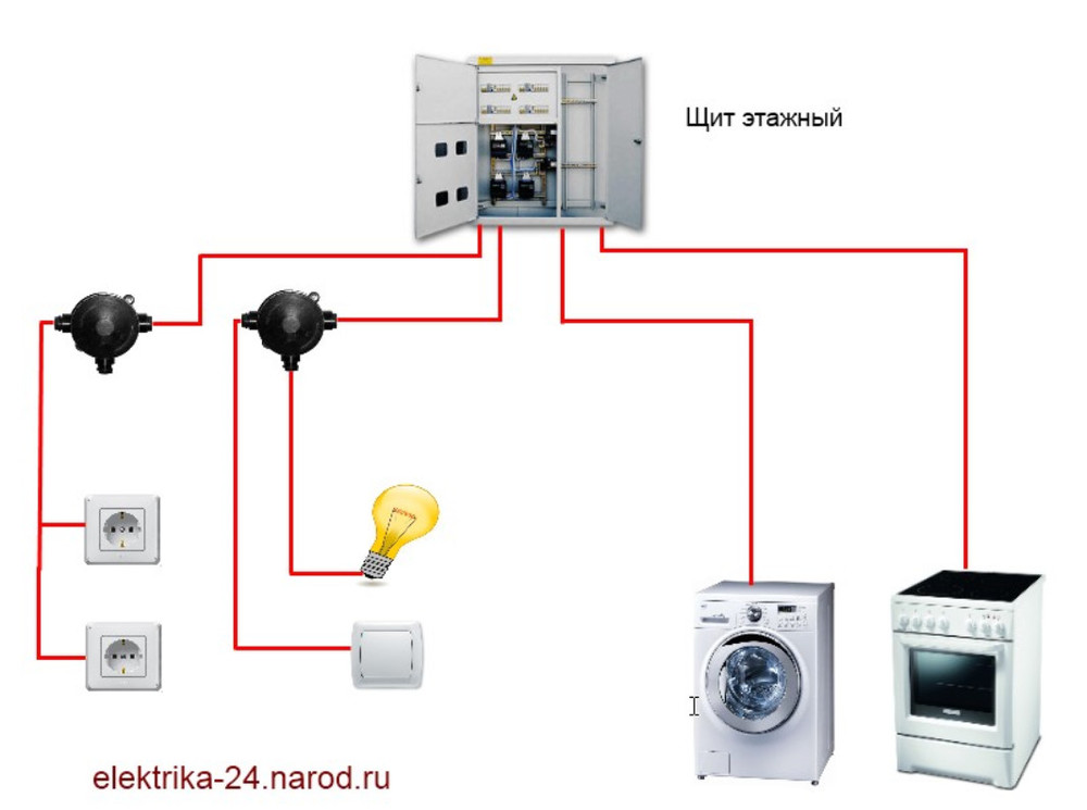 На остальные розетки в квартире можно пробросить общий кабель до распределительной коробки, а от нее уже выполнить разводку кабелем на каждую розетку или блок розеток. С освещением поступим так же, на коробку бросим общий провод, а от коробки сделаем разводку к светильникам и выключателям.