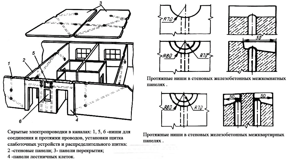 Проводка в панельных домах прокладывается в специальных каналах внутри панелей. Они предусмотрены конструкцией плит. На рисунке ниже вы видите несколько примеров типовых расположений каналов.