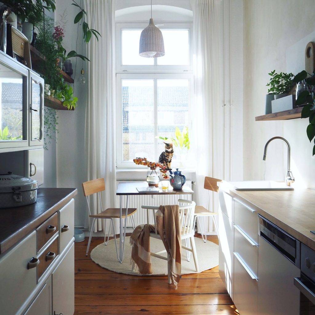 Для маленькой кухни лучше выбирать светлые шторы с небольшим принтом
