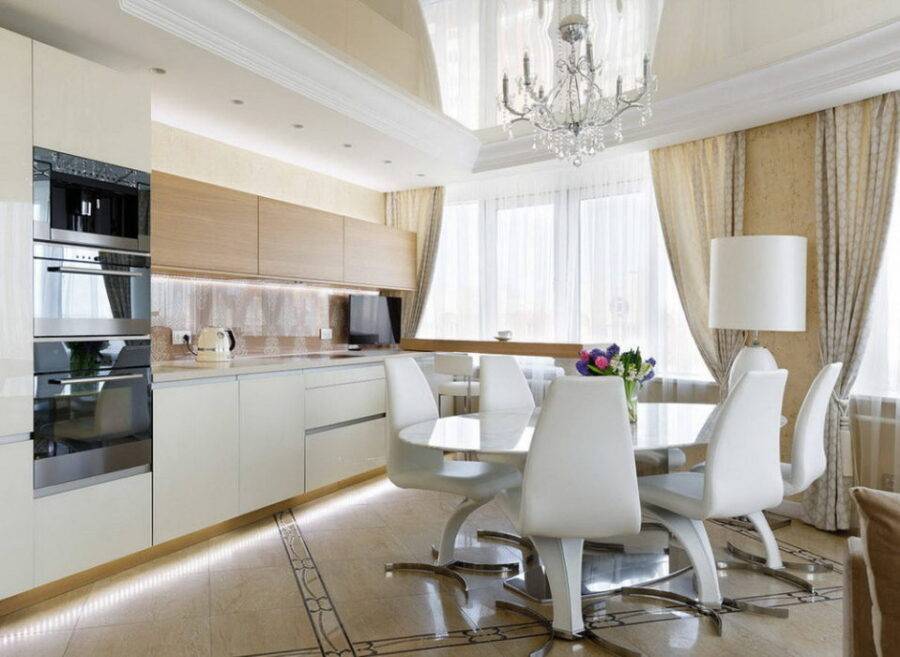 На фото представлен дизайнерский прием, при котором косые углы кухни визуально смягчаются длинными занавесками.