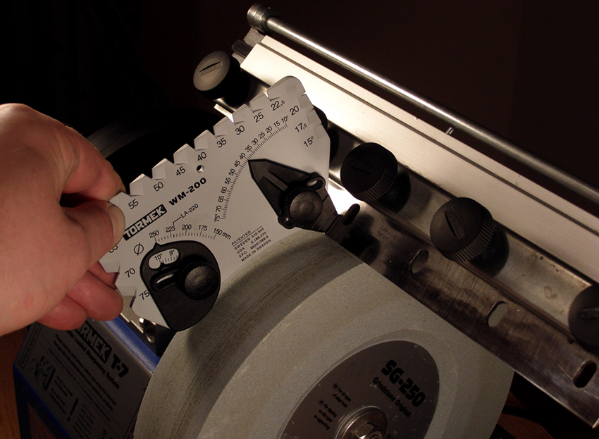 Для правильной заточки изготовьте из фанеры несколько шаблонов с углами 14-20º для режущих и 30-37º для рубящих кромок, точный угол зависит от марки стали. Зафиксируйте лезвие параллельно кромке подручника и прижмите его планкой. По шаблону отрегулируйте угол между плоскостями точильной колодки и наклонной дощечки стола.