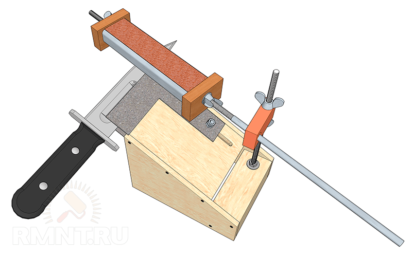 Простым приспособлением для затачивания ножей является инструмент, состоящий из пары деревянных реек и пары брусков с абразивом, с одинаковыми геометрическими размерами.