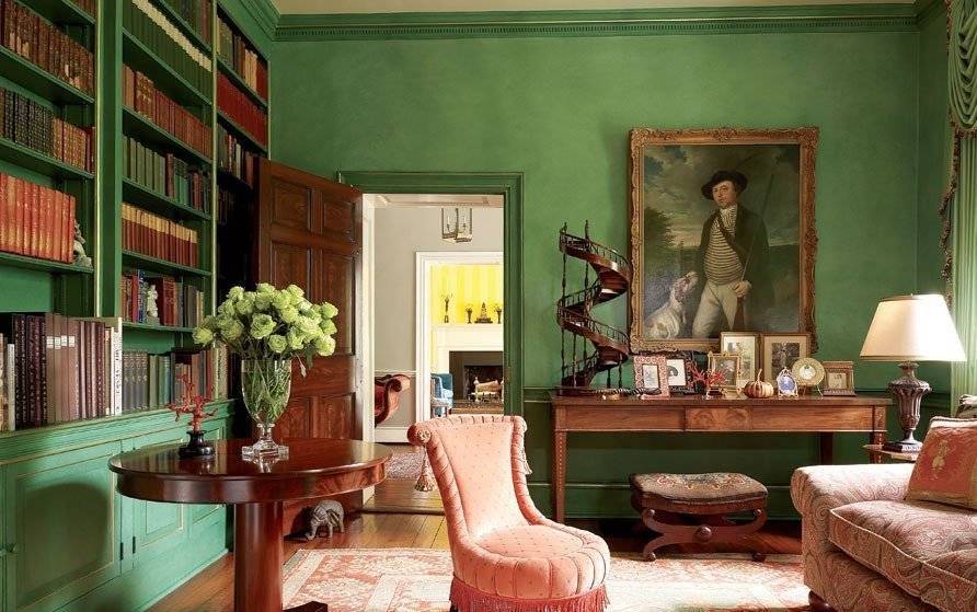 Кабинет Наполеона во дворце Фонтенбло оформлен именно в зеленом цвете и является достойным примером для подражания. К такому помещению идеально подходит массивная мебель с элементами художественной резьбы или строгие, лаконичные варианты. Для рабочего кабинета удачным выбором станут изумрудные, темно-зеленые обои, которые придадут помещению серьезности и элегантной роскоши одновременно. Данный цвет декоративных полотен способен нормализовать кровяное давление, расширить капилляры, поспособствует улучшению умственной работоспособности и повышению концентрации внимания при работе. Вертикальные полосы на темно-зеленых обоях подчеркнут строгий, лаконичный интерьер, а золоченные узоры на изумрудных полотнах создадут по королевски роскошное помещение.