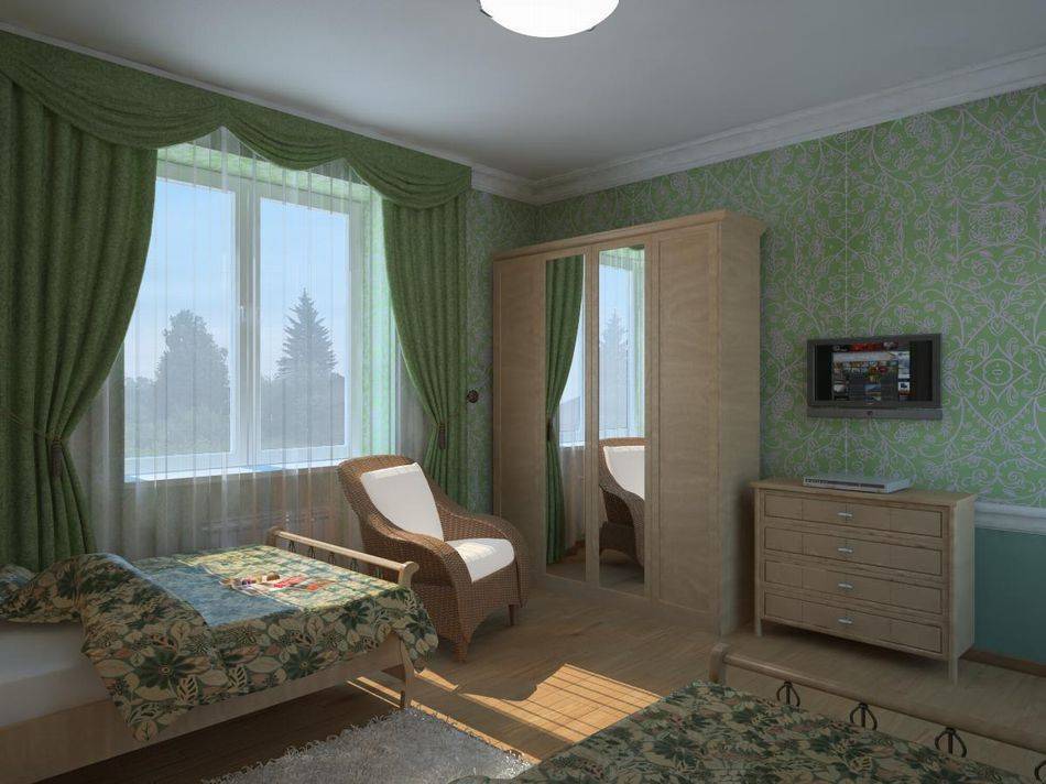 Помните! Цвет штор к зеленым обоям должен сочетаться с полом и мебелью. Текстиль выбирается на последней стадии декорирования интерьера, когда все элементы дизайна и аксессуары уже подобраны и расставлены.