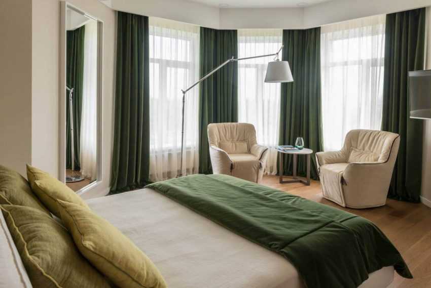 Шторы в зеленых тонах в спальню способны стать изюминкой интерьера. Они великолепно смотрятся на фоне светлых поверхностей