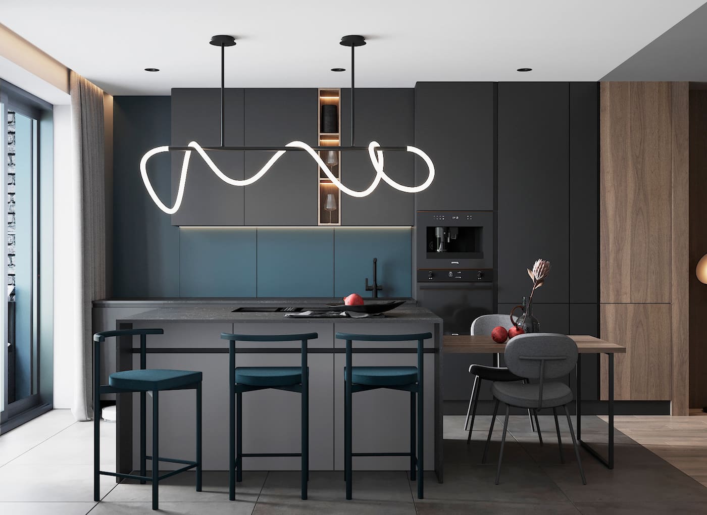 Зеленые кресла в качестве смягчающих акцентов на строгой кухне.