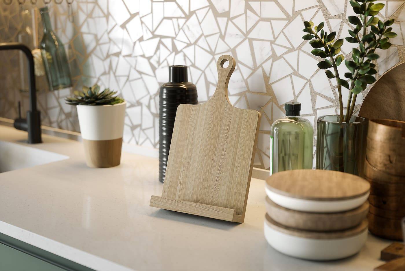 Для его воплощения достаточно обзавестись современным пластмассовым гарнитуром зелёного цвета. Выбранный тон могут иметь также декоративные изделия и бытовая техника, однако могут быть белыми или выполненными под «металлик».