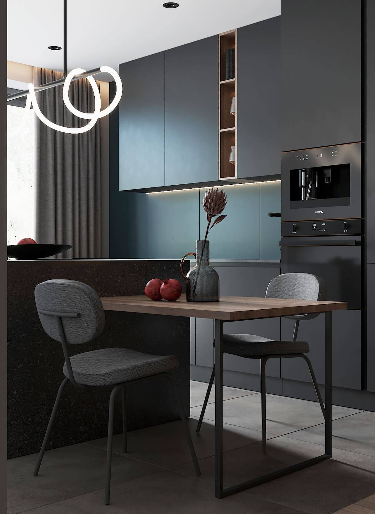 Для этого образа оформления характерны простые, правильные формы, много прямых линий, отказ от лишних деталей. Ручки ящиков зачастую отсутствуют, дверцы открываются простым нажатием. Лаконичный и максимально функциональный гарнитур может быть выполнен полностью или частично в спокойном фисташковом или бирюзовом цвете в сочетании с белым или серым оттенком.