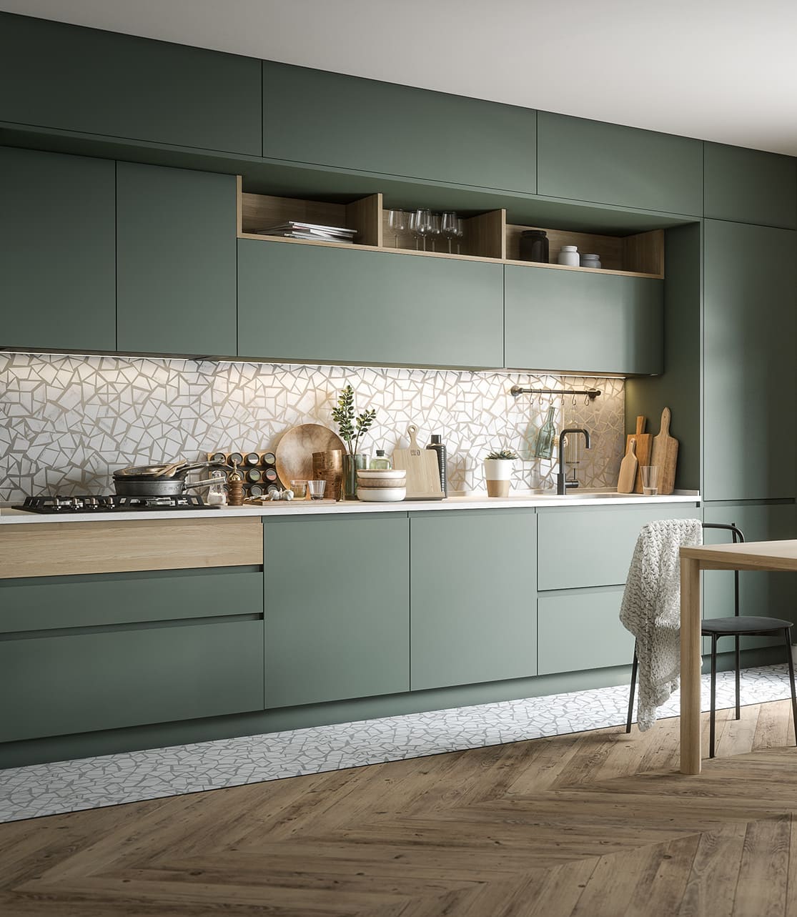 Разнообразие зеленого цвета в интерьере кухни.
