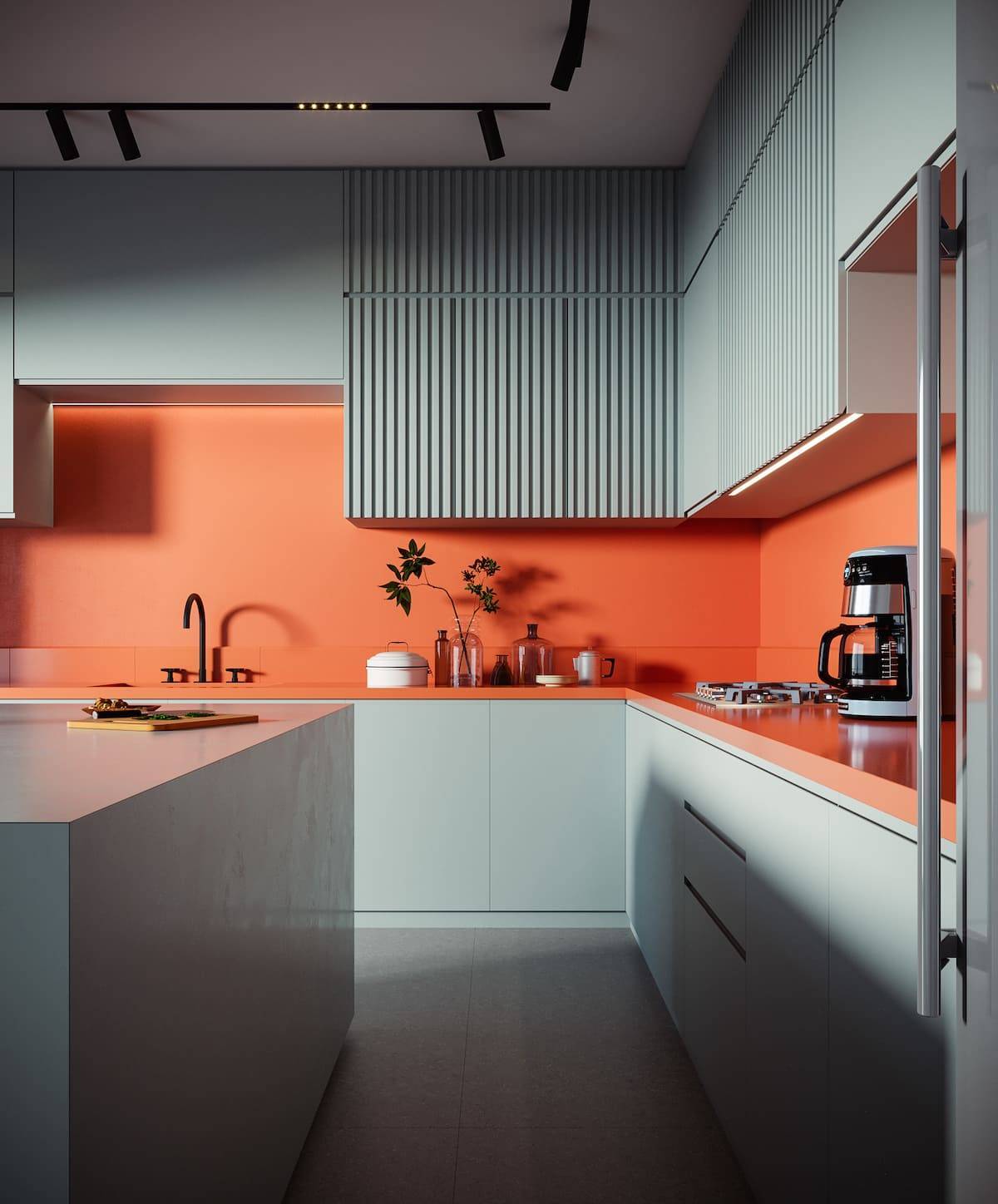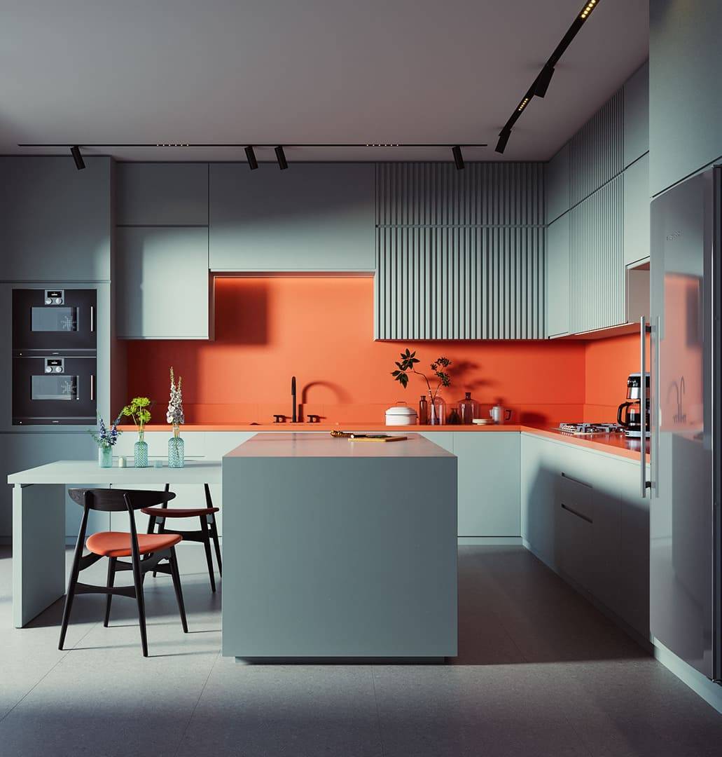 Коралловый. Такой цвет отлично гармонирует с насыщенным ярким. Кухонная мебель, выполненная в коралловом цвете, необычно выглядит с желтым или бирюзовым полом. Стены и потолок лучше всего оставить белыми, чтобы не переполнить комнату яркими оттенками.