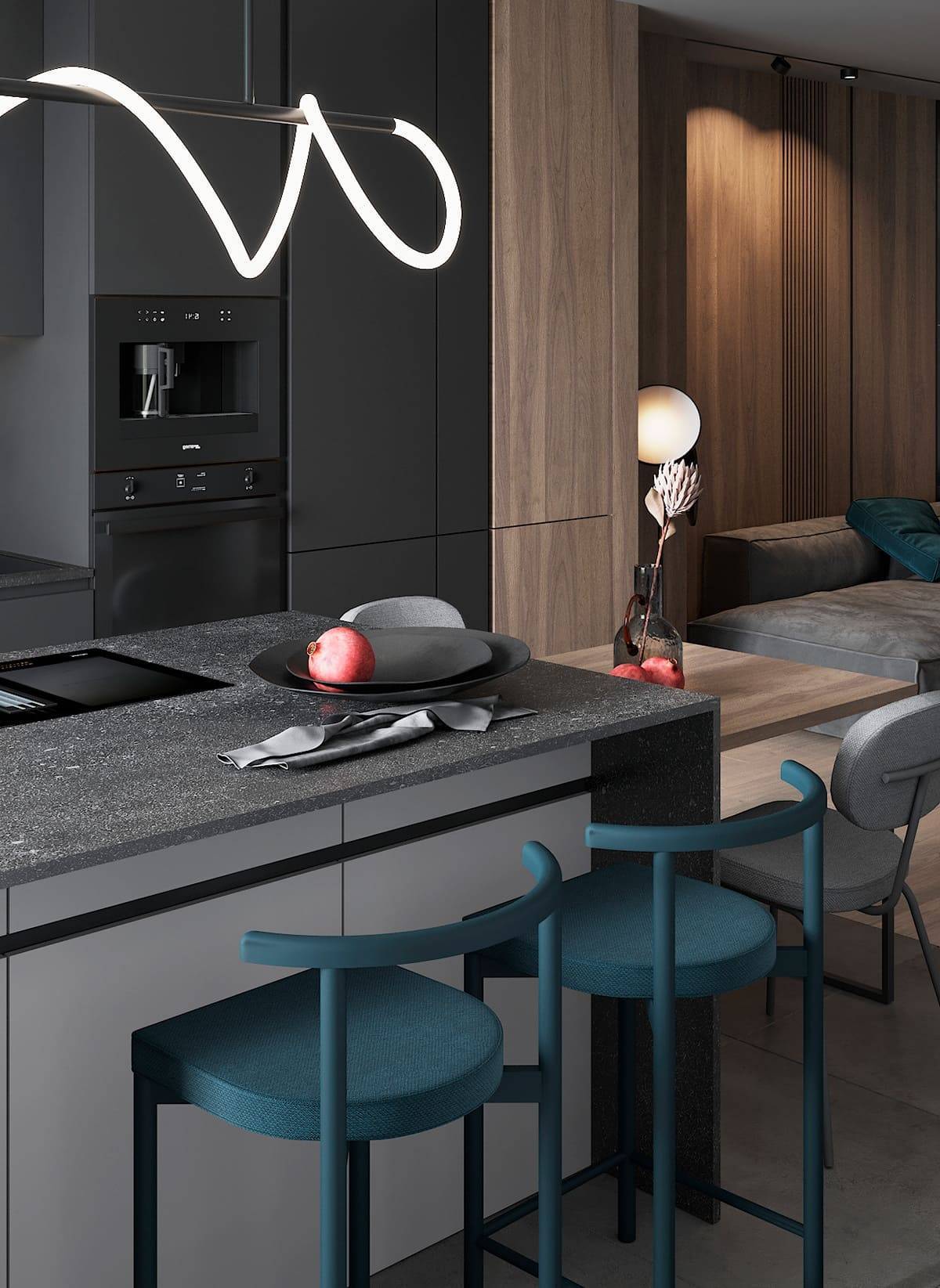 Кухонный остров не только красиво разделяет пространство на кухню-столовую и гостиную, но также позволяет скрыть беспорядок, который часто царит на кухонной стойке. Табуреты подобраны для него придадут интерьеру кухни 2022 современный характер. Чтобы максимально использовать пространство, мы можем разместить дополнительные шкафы в баре или на острове.