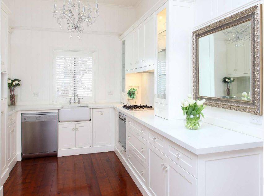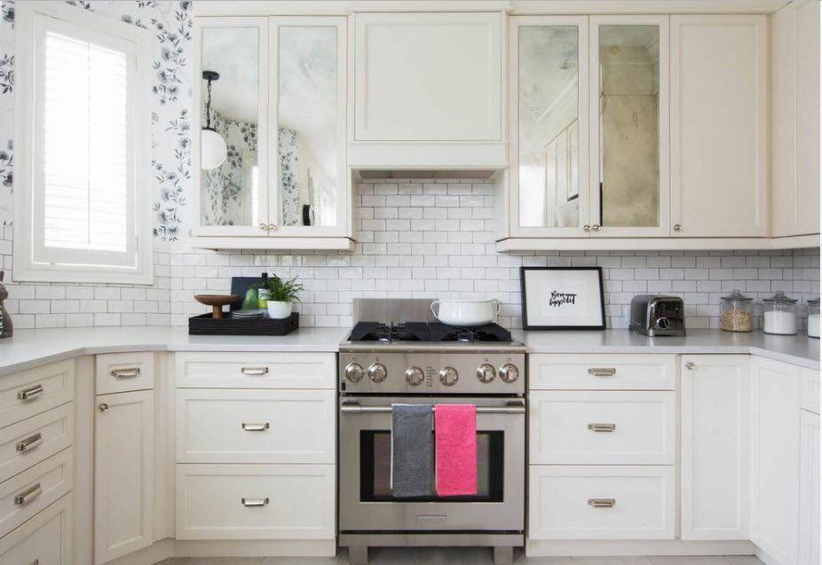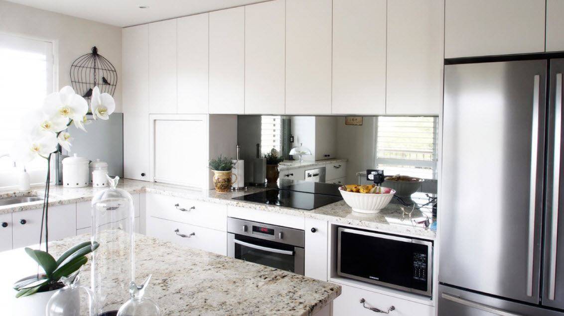 Если стена не загромождена верхними шкафчиками, то зеркало может вполне успешно занять их место. Поверх него можно разместить аккуратные открытые полочки, но помните – отражения в таком случае удвоят содержимое.