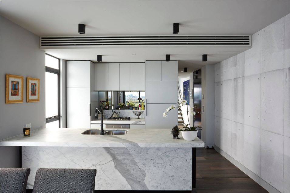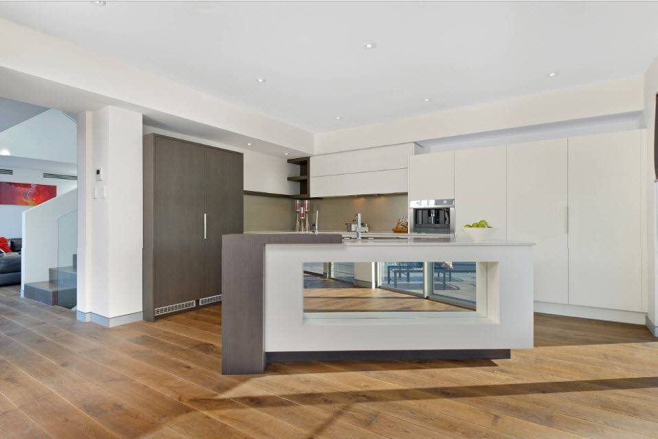 Но существенный недостаток – это маркость, присущая всем глянцевым поверхностям. В данном случае можно подобрать альтернативное и более практичное место для зеркальной поверхности – это фасады кухонного острова.